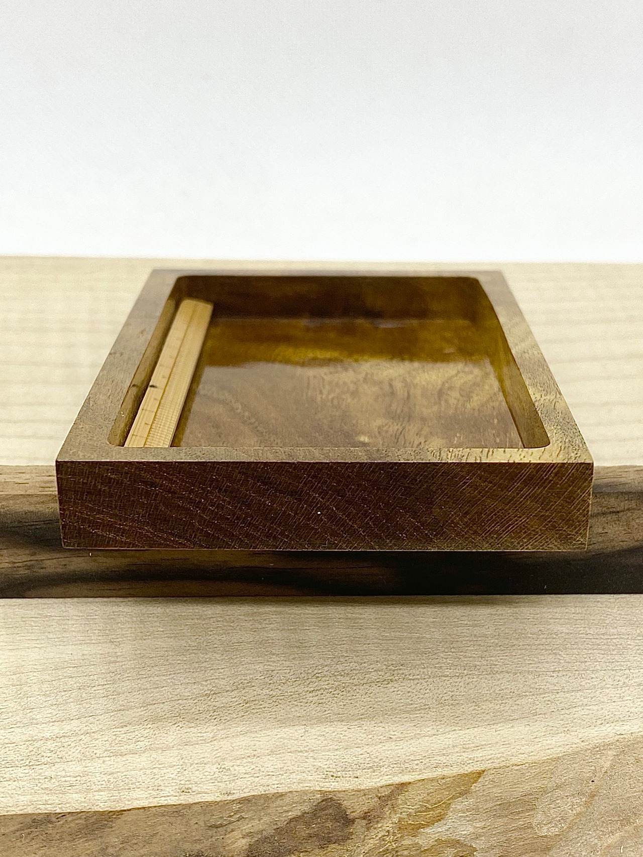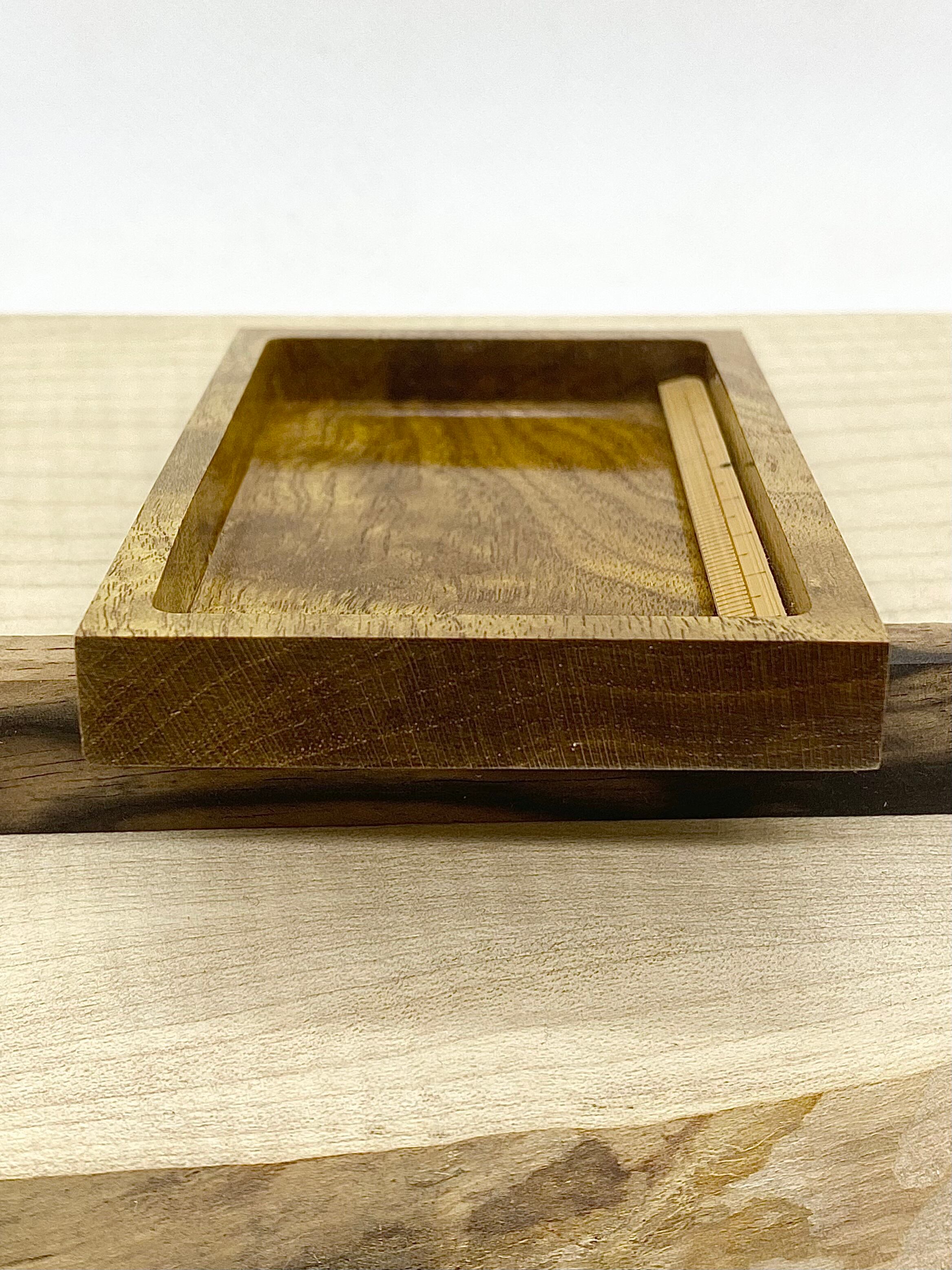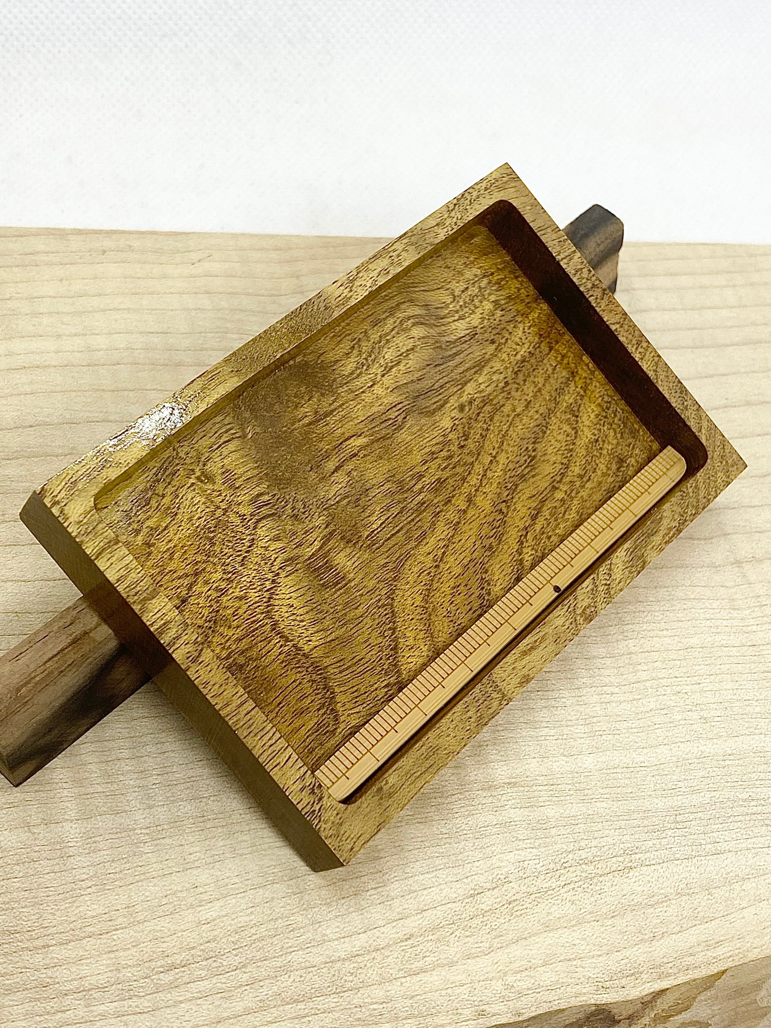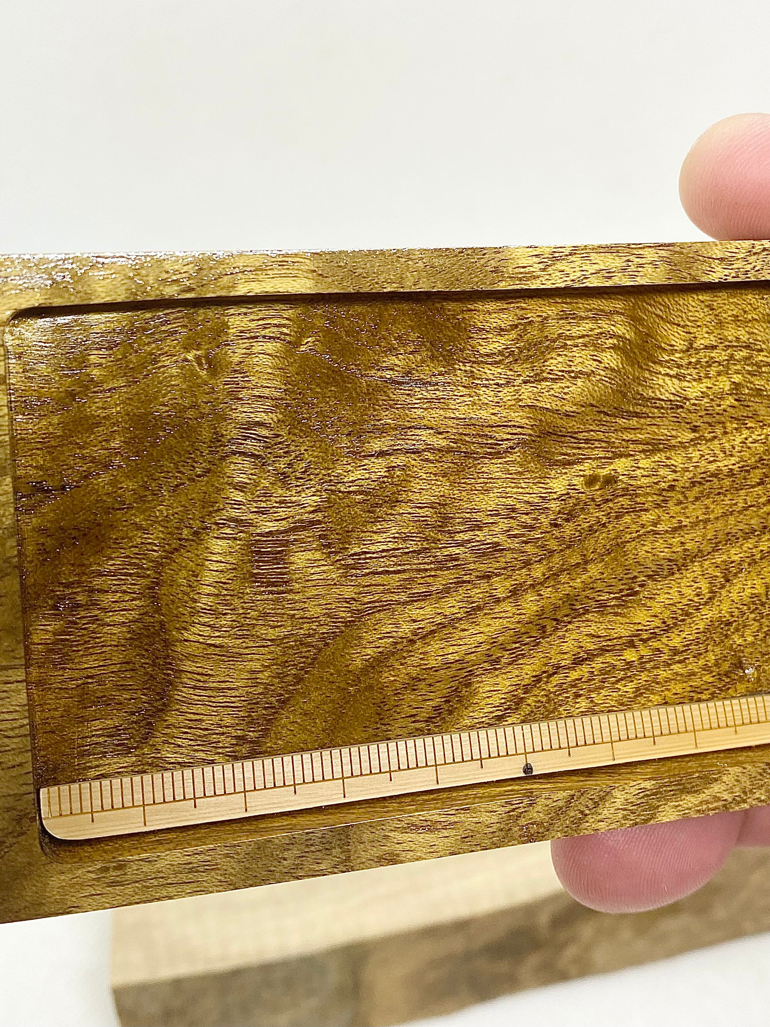 伝統工芸、指物師が溺愛する御蔵島桑根杢の削り込み作製のスケールです。ギラギラと杢、ギンがバッチリ入った良杢材を使用しました。